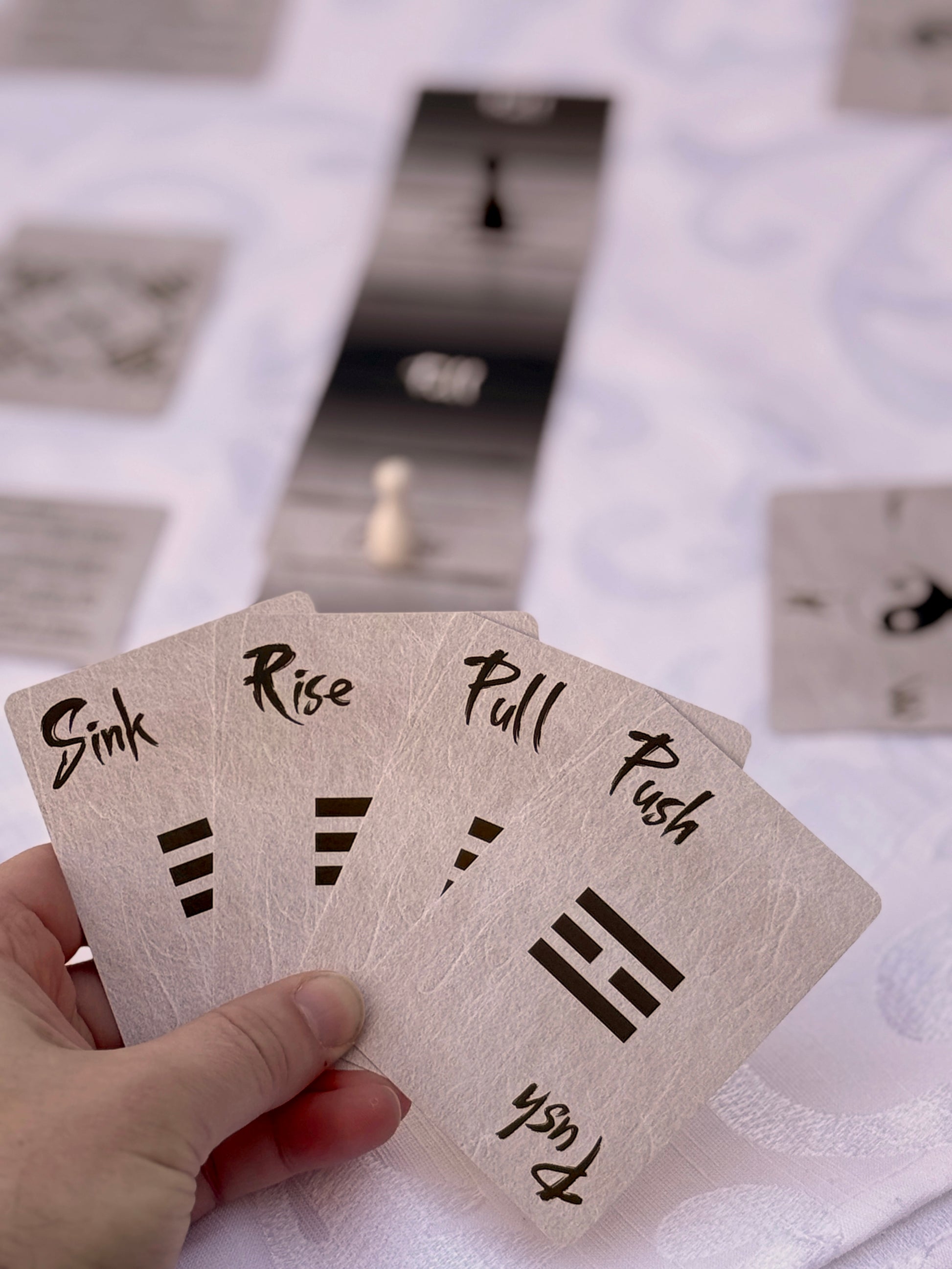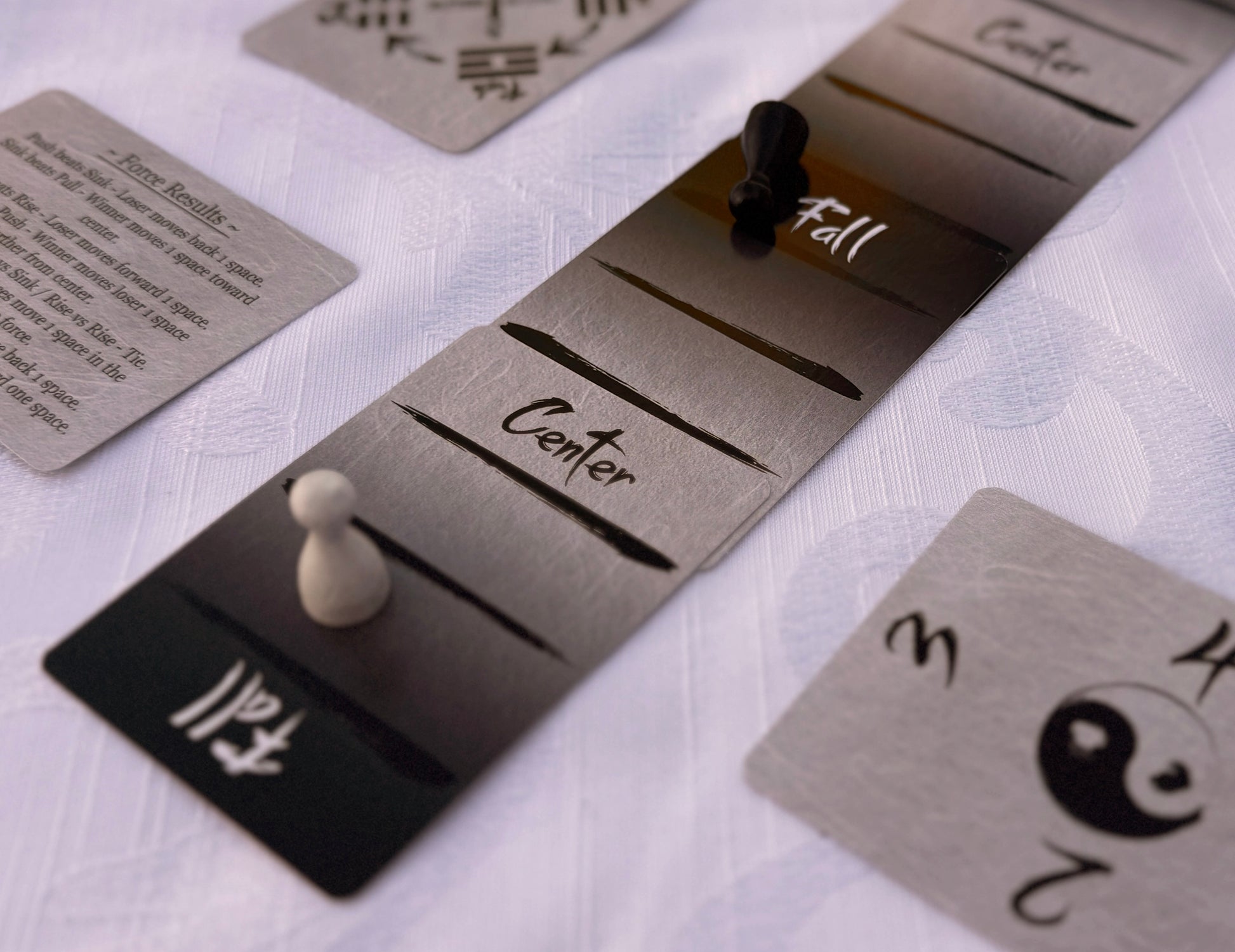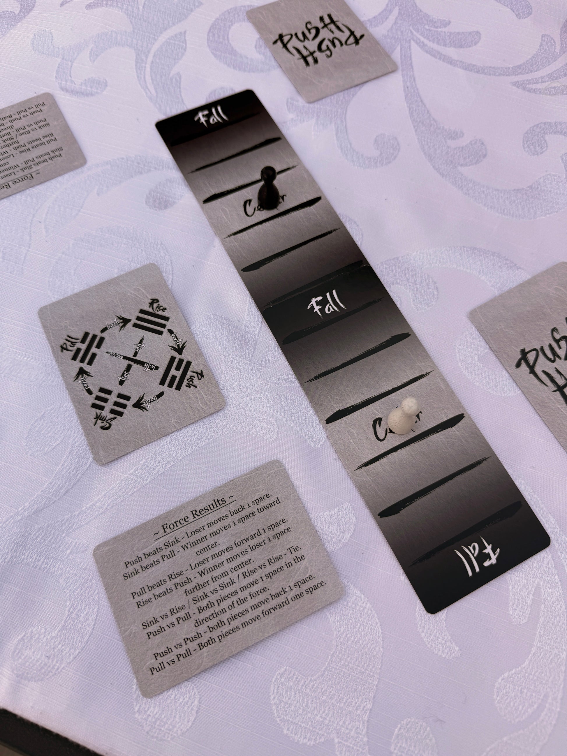 Based on the Tai Chi practice of the same name, knock your partner off balance while maintaining your own center. You have 4 forces to apply and must decide each turn which one to play against the force played by the other side. Limited edition of only 100 copies made!
